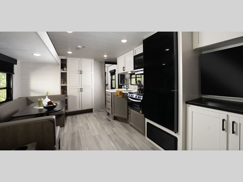 Inside, you'll appreciate the pet and kid friendly residential vinyl flooring that is easy to clean, plus there are hardwood cabinet doors and pressed membrane kitchen countertops you are sure to love. The Open Range Conventional is available in many floorplans, including easy-to-tow single-axle models and spacious dual-axle models; there's something for everyone!